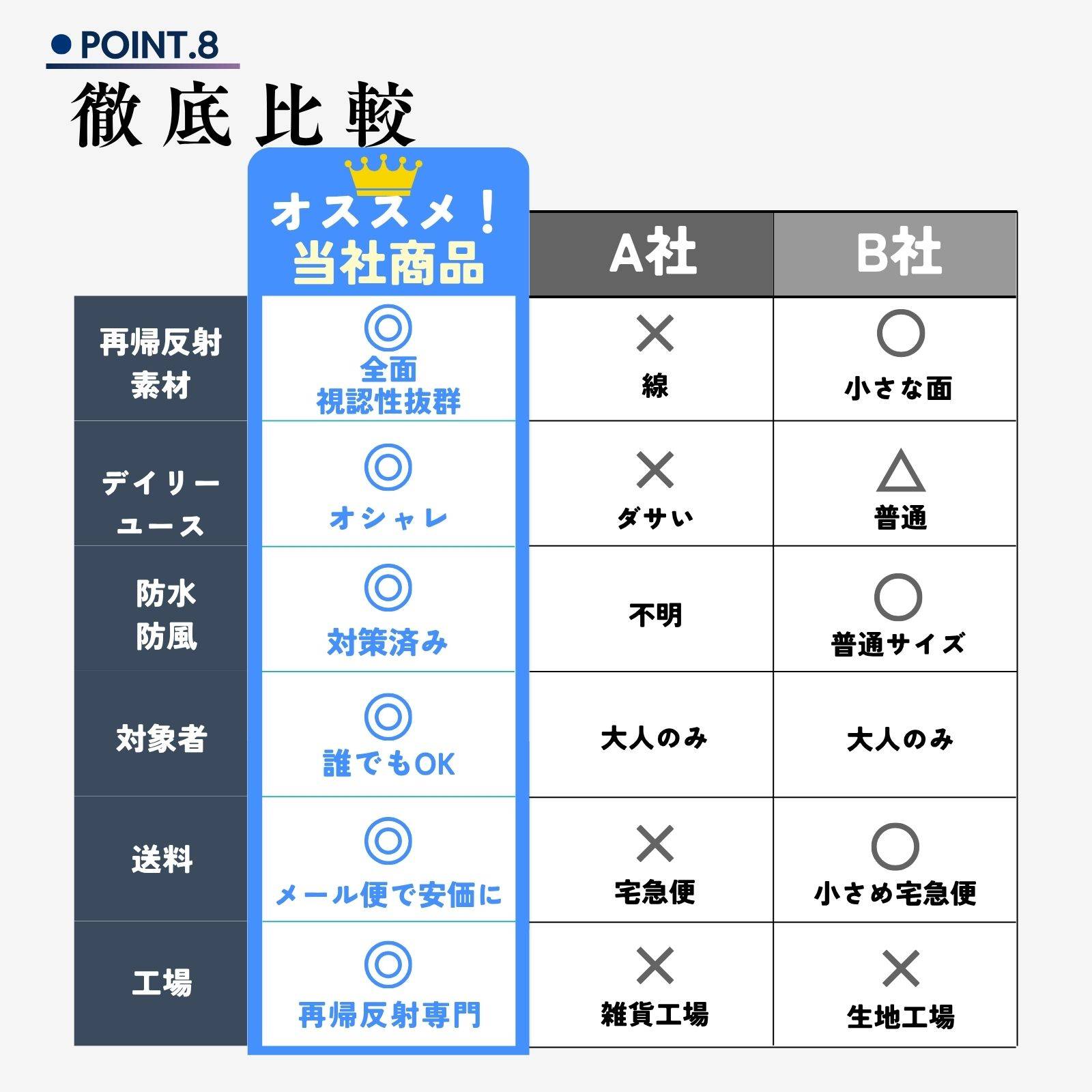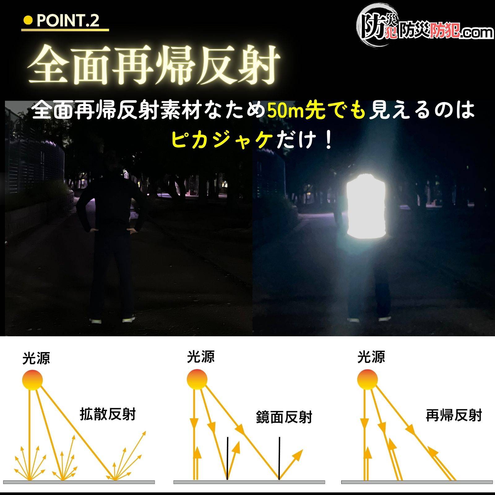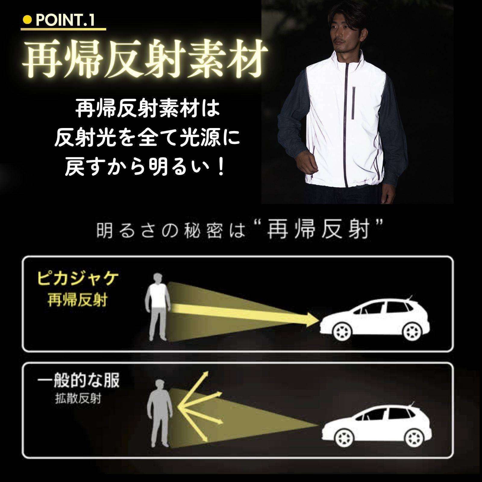 ピカジャケに当てられた車などのヘッドライトの光は、そのまま車に光を戻すので、遠くからでもピカジャケに気付くことが容易になります。