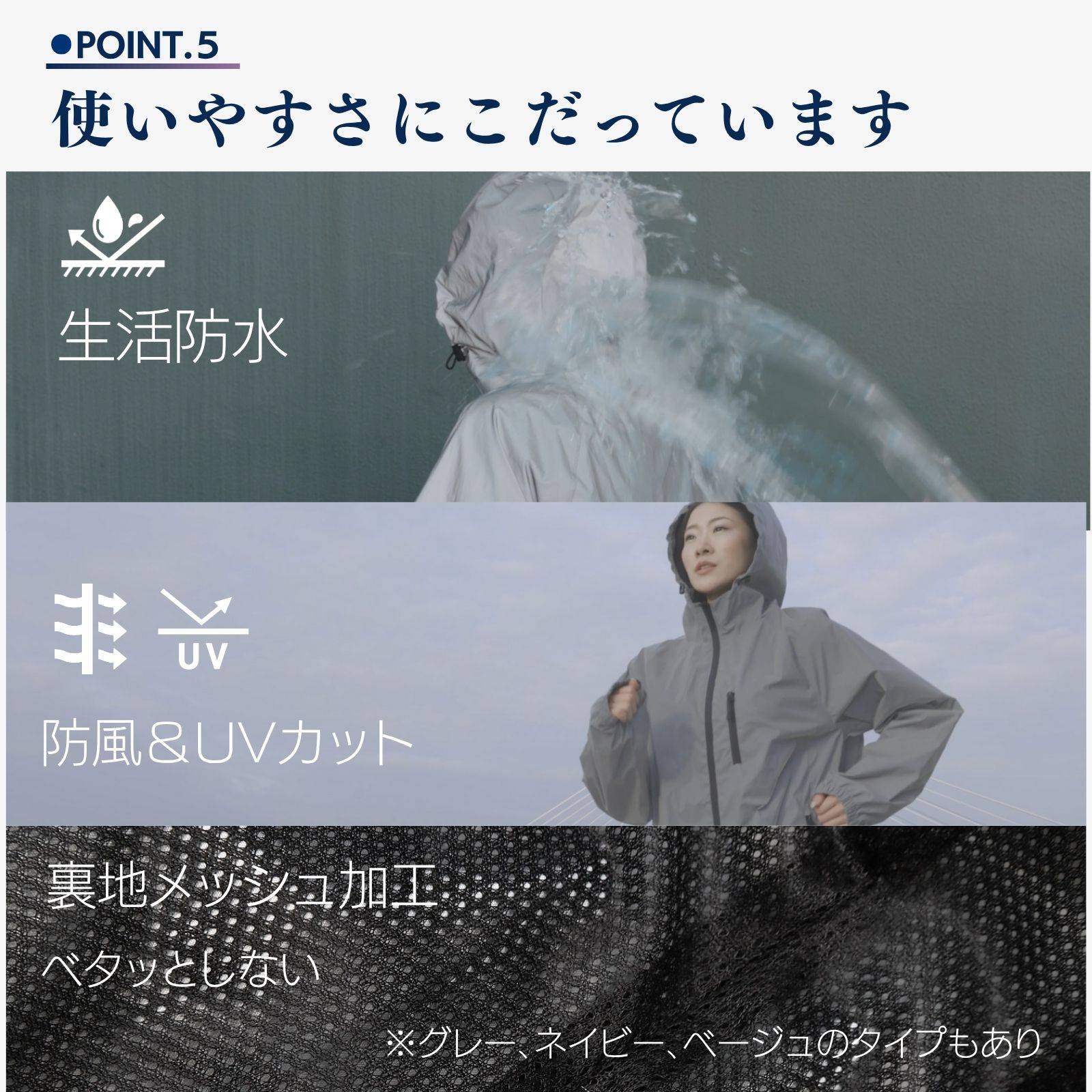 A:完全撥水加工の場合は通気性が悪くなるため生活防水レベルの撥水です、ご理解くださいませ。